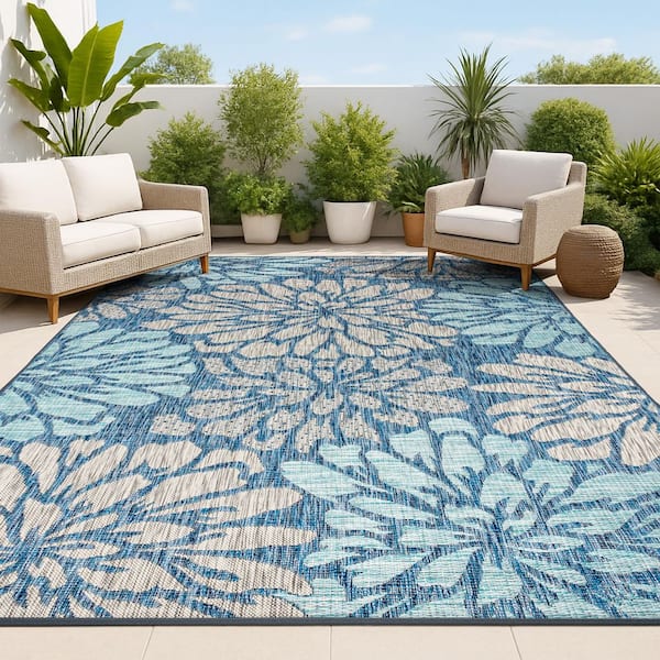 Zinnia Modern Floral Navy/Aqua 3 ft. 11 in. x 6 ft. Textured Weave Indoor/Outdoor Area Rug