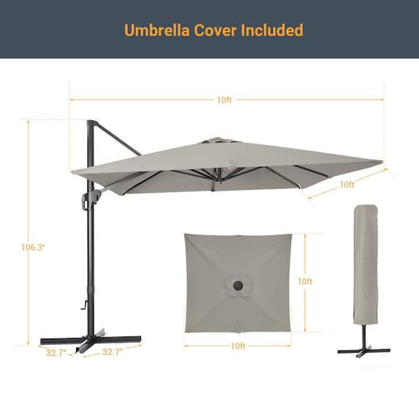 10 ft. Aluminum Cantilever Patio Umbrella High-Quality Solution-Dyed Fabric 360° Rotation System in Gray