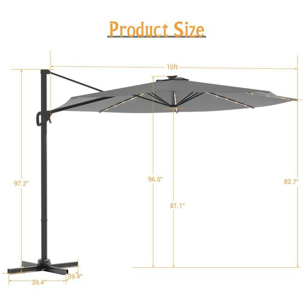10 ft. LED Round Cantilever Umbrella Solution-Dyed Fabric, Metal Frame and Innovative 360° Rotation System in Gray