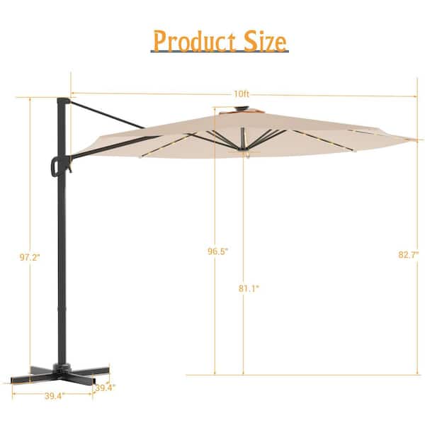 10 ft. LED Round Cantilever Umbrella Solution-Dyed Fabric, Metal Frame and Innovative 360° Rotation System in Sand