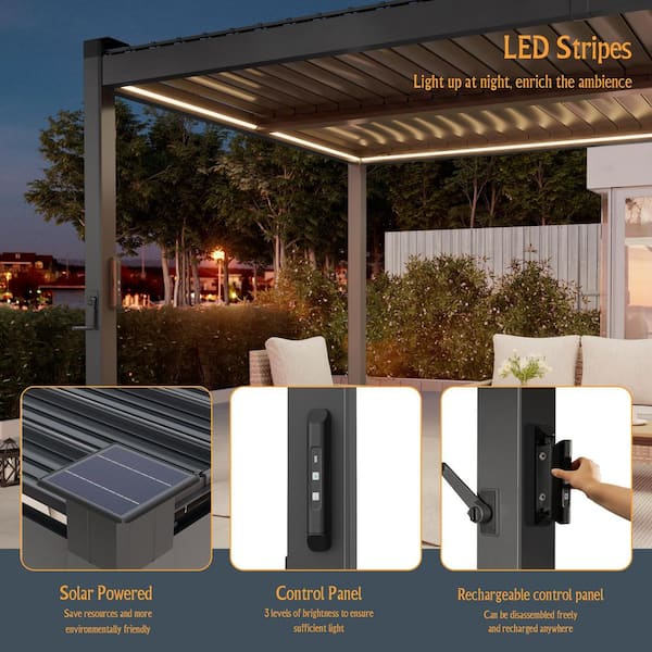 10 ft. x 13 ft. Modern All-Aluminum Pergola with Detachable Control Panel LED and Hand Crank Louvers, Grey
