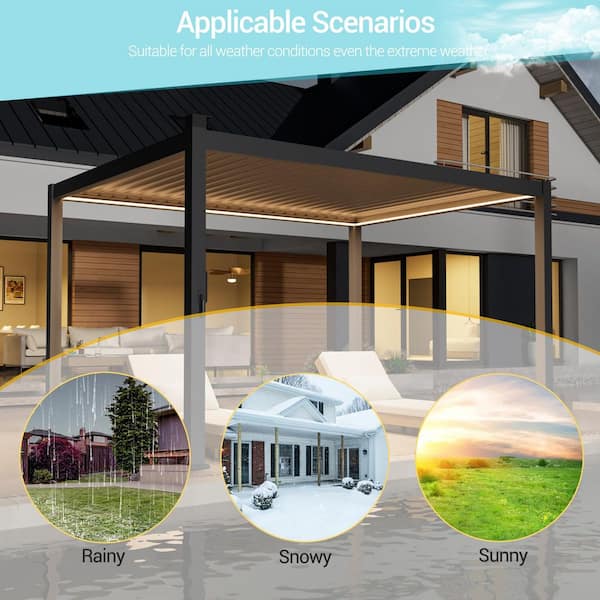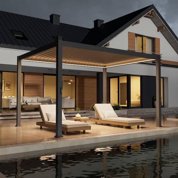 10 ft. x 13 ft. Modern Aluminum Pergola with Adjustable Louvers, LED Lights and Solar Charging, Charcoal Gray