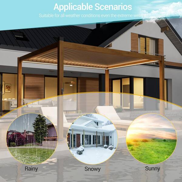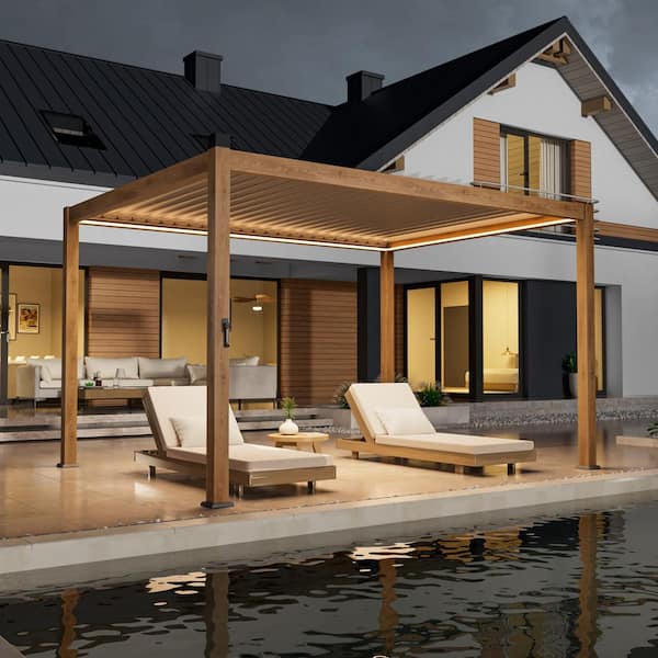 10 ft. x 13 ft. Modern Aluminum Pergola with Adjustable Louvers, LED Lights and Solar Charging, Wood Grain