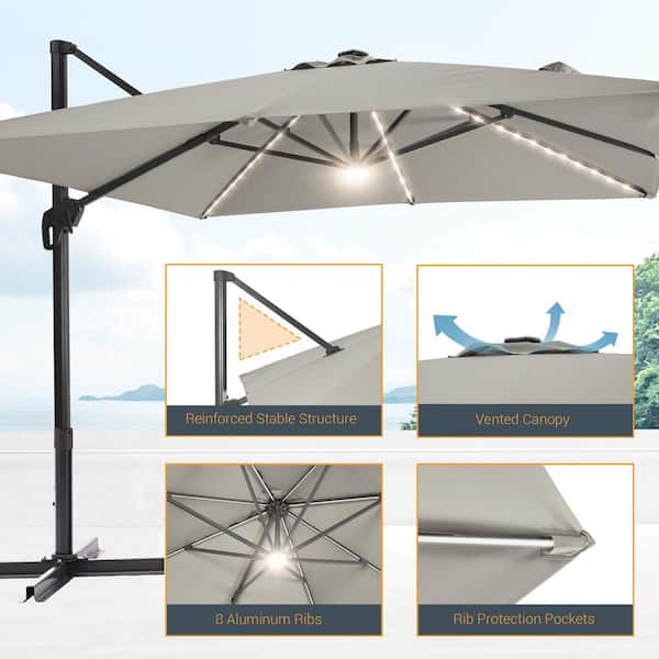 11.5 x 9 ft. Rectangular Aluminum Pole Cantilever LED Patio Umbrella Solution-Dyed Fabric, Gray