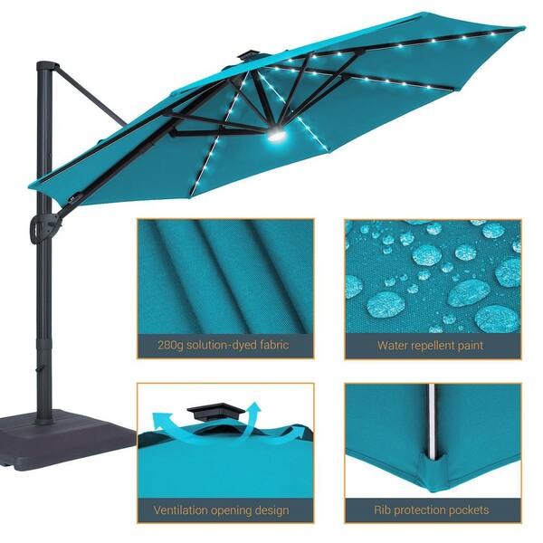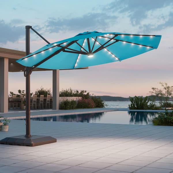 11 ft. LED Aluminum Cantilever Patio Umbrella with Outdoor Offset Rotation and a Base in Lake Blue