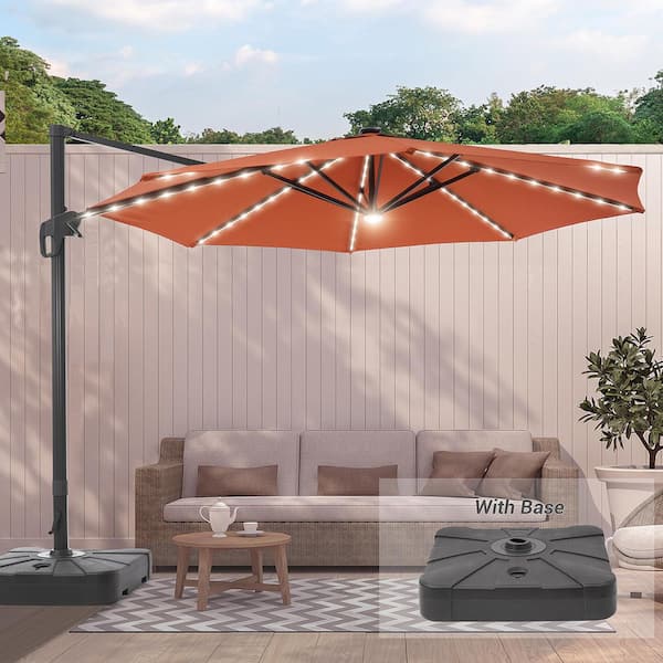 11 ft. Solar LED Aluminum Cantilever Patio Umbrella with a Base, Offset Hanging 360° Rotation in Red