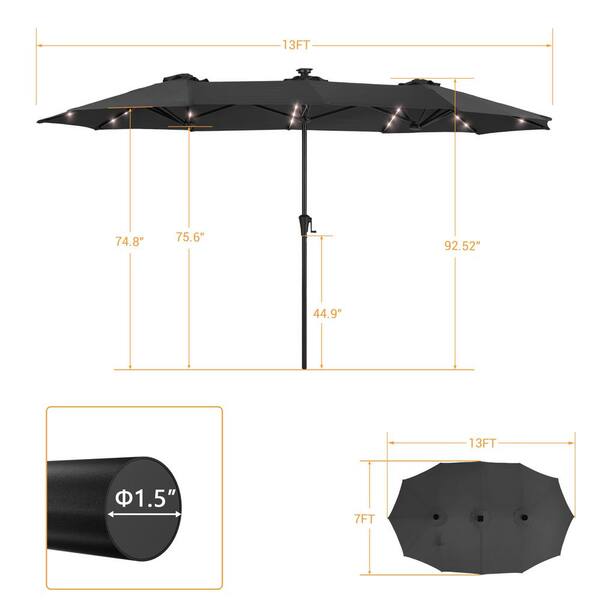 13 ft. x 7.2 ft. Steel Solar-Powered Double-Sided Market Patio Umbrella with Crank, Solar Panel in Black