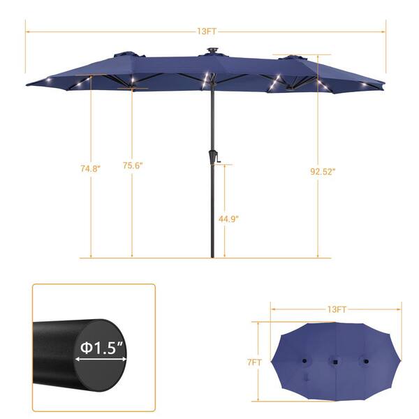 13 ft. x 7.2 ft. Steel Solar-Powered Double-Sided Market Patio Umbrella with Crank, Solar Panel in Navy Blue