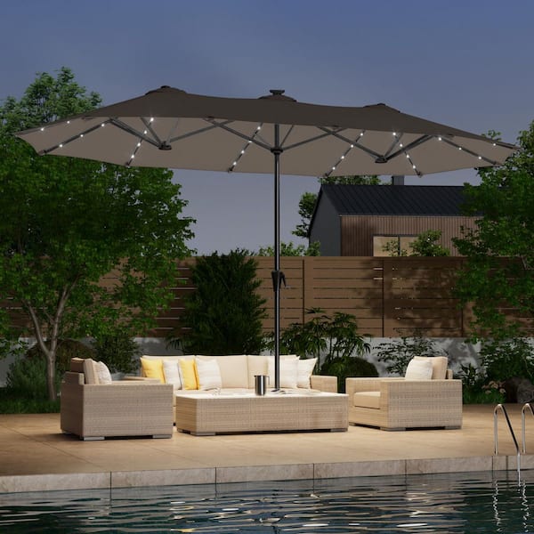 13 ft. x 7.2 ft. Steel Solar-Powered Double-Sided Market Patio Umbrella with Crank, Solar Panel in Taupe