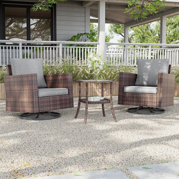 3-Piece Brown Wicker Patio Bistro Set Swivel Rocking Chairs with Side Table, Linen Grey