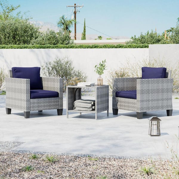 3-Piece Gray Wicker Patio Bistro Set Outdoor Single Sofa Set with Side Table for Outdoor Lawn, Navy Blue Cushions