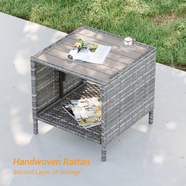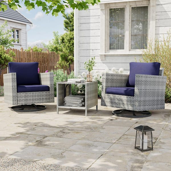 3-Piece Gray Wicker Patio Bistro Set Swivel Rocking Chairs for Outdoor Occasions of Lawn, Navy Blue