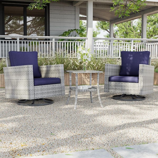 3-Piece Gray Wicker Patio Bistro Set Swivel Rocking Chairs with Side Table, Navy Blue