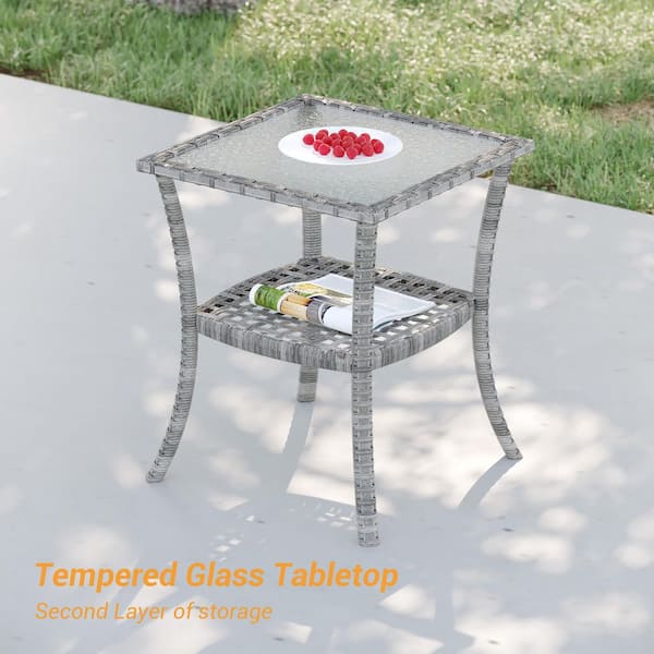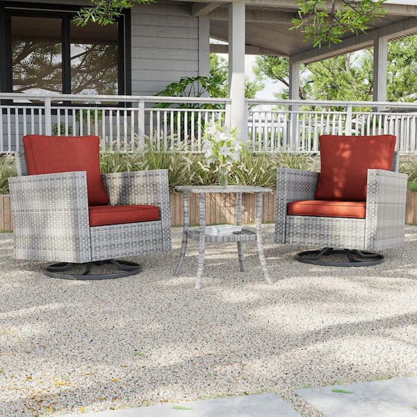 3-Piece Gray Wicker Patio Bistro Set Swivel Rocking Chairs with Side Table, Rust Red