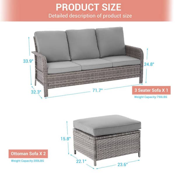 3-Pieces All-Weather Patio Conversation Couch with Ottoman Set Gray Wicker with Gray Cushion