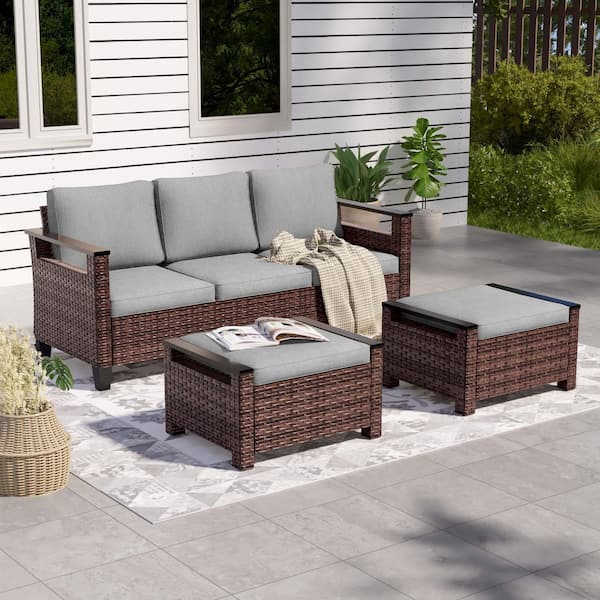 3-Pieces Brown PE Wicker Gray Cushions Patio Conversation Wide Armrests High Back Sofa Design