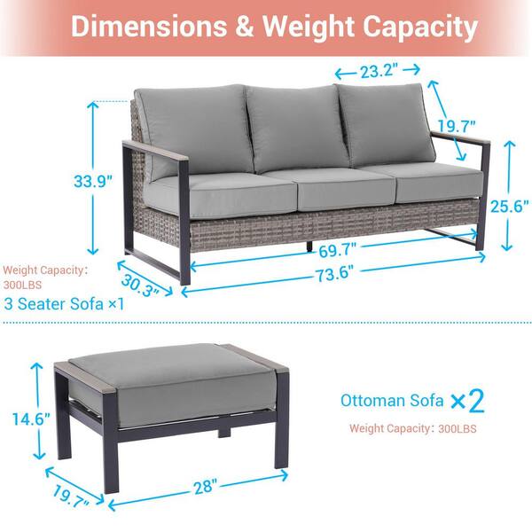 3 Pieces Patio Conversation Set Sofa with Ottomans All-Weather PE Rattan Gray Wicker with Gray Cushion