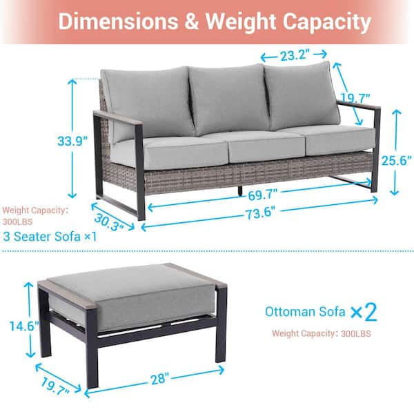 3 Pieces Patio Conversation Set Sofa with Ottomans All-Weather PE Rattan Gray Wicker with Linen Grey Cushion
