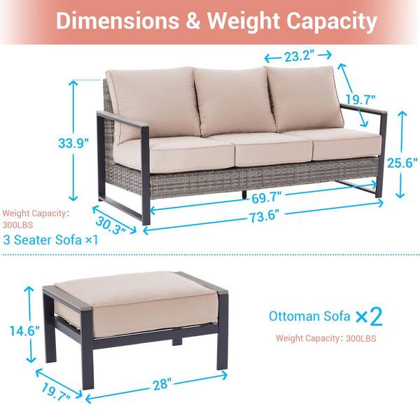 3 Pieces Patio Conversation Set Sofa with Ottomans All-Weather PE Rattan Gray Wicker with Sand Cushion