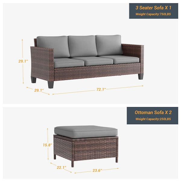3-Seater Patio Brown Wicker Sofa set with Ottomans, Gray Cushion
