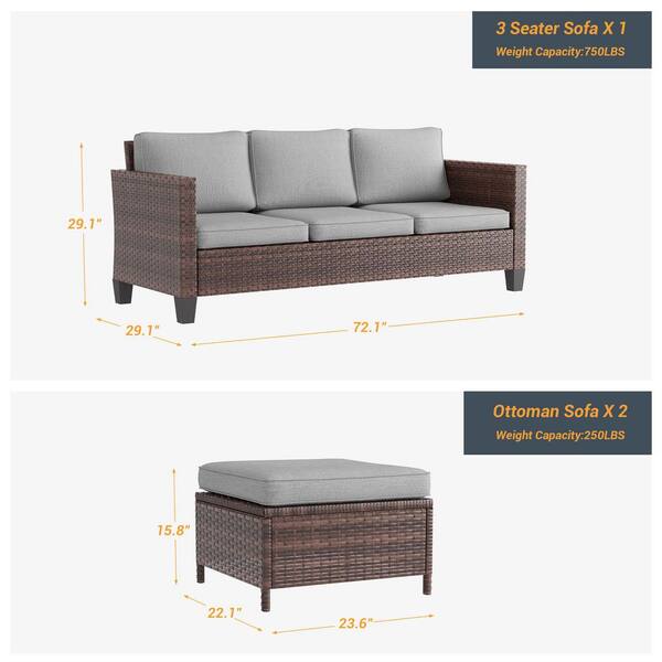 3-Seater Patio Brown Wicker Sofa set with Ottomans, Linen Grey Cushion