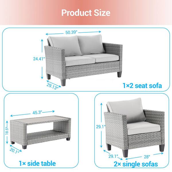 4-Pieces Patio Conversation Set Outdoor Loveseat Sofa with Coffee Table Gray Wicker Removable Linen Gray Cushions