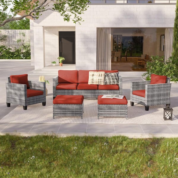 5-Piece Outdoor Patio Conversation Set Widened Back and Arm Grey Rattan 3-Seat Sofa 2-Ottomans, Rust Red