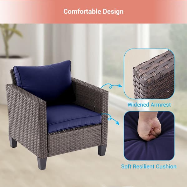 5-Pieces Brown PE Wicker Patio Conversation Set with Side Table and Ottomans with Washable Navy Blue Cushion
