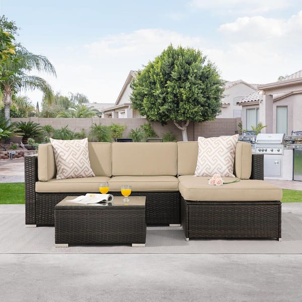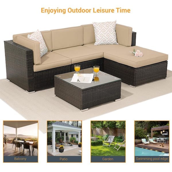 5-Pieces PE Rattan Wicker Outdoor Conversation Sectional Sofa Sets Sofa Sets With Tempered Glass Table in Beige