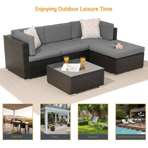 5-Pieces PE Rattan Wicker Outdoor Conversation Sectional Sofa Sets Sofa Sets With Tempered Glass Table in Gray