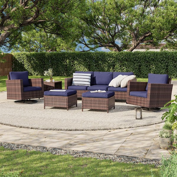 6-Piece Brown Wicker Outdoor Seating Sofa Set with Swivel Rocking Chairs, Navy Blue Cushion