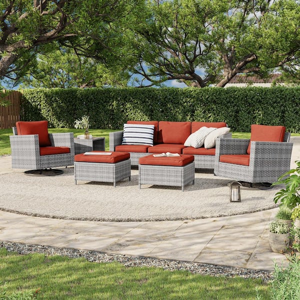 6-Piece Gray Wicker Outdoor Seating Sofa Set with Swivel Rocking Chairs, Rust Red Cushion