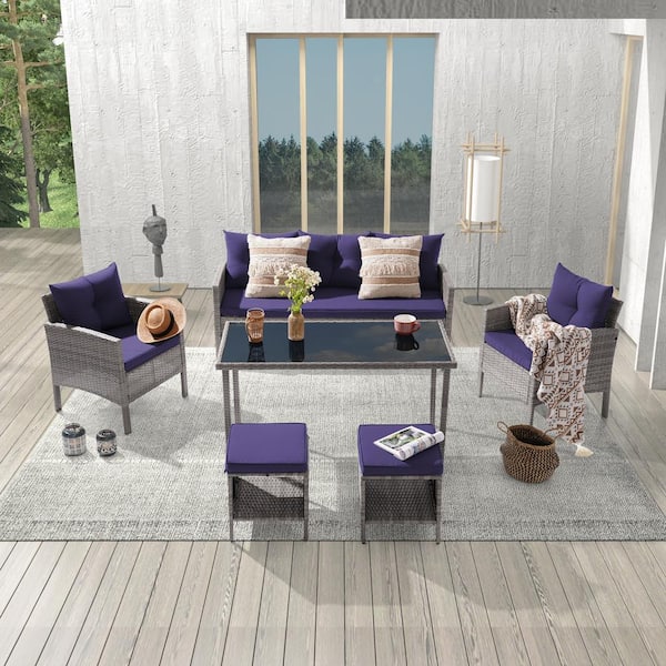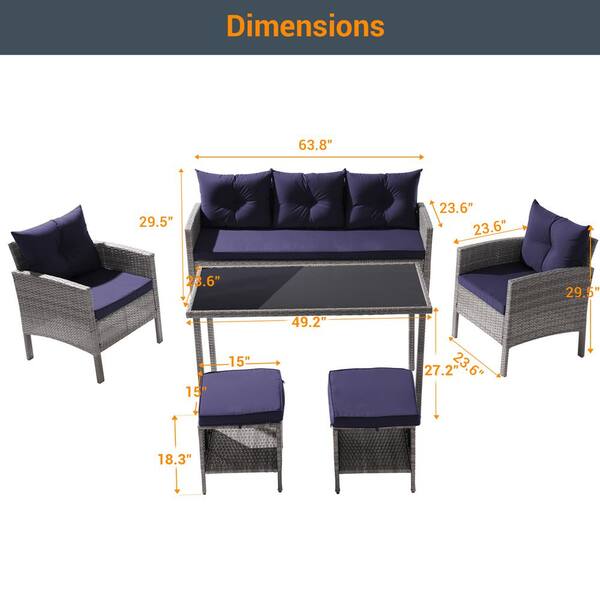 6-Piece Patio Outdoor Wicker Conversation Sofa Set Thickening With 3-Seater and Table for Poolside, Navy Blue Cushions