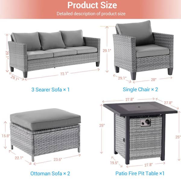 6-Pieces Patio Conversation Set with Square Fire Pit Table, Gray Wicker Wide Armrests Sofa with Gray Cushion