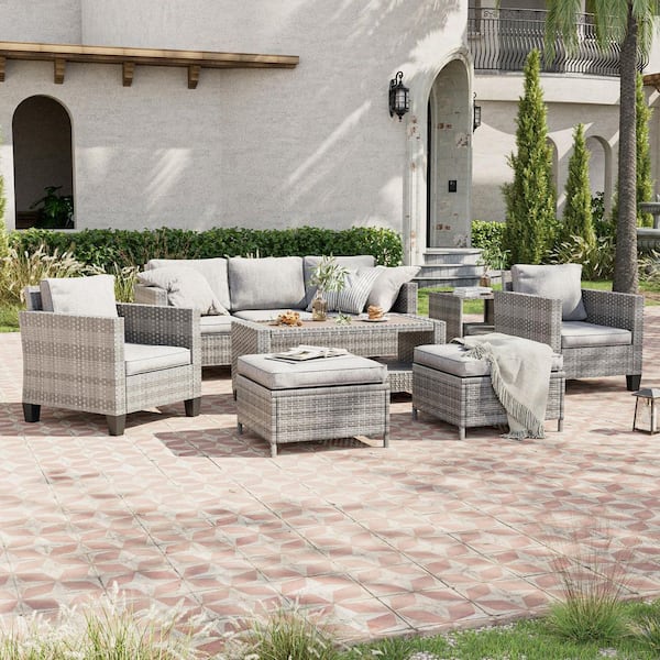 7-Piece Gray Wicker Outdoor Conversation Seating Sofa Set with Coffee Table, Linen Grey Cushions