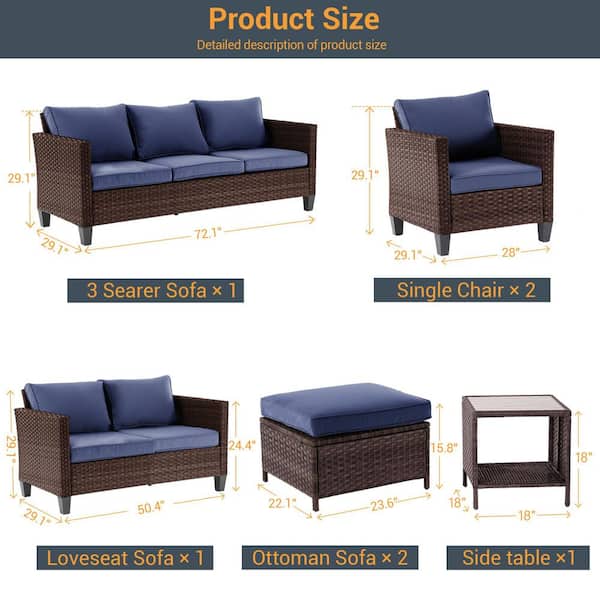 7-Pieces Patio Conversation Set with Loveseat Sofa and Side Table All-Weather Brown Wicker with Navy Blue Cushions