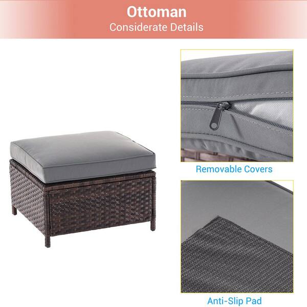 7-Pieces Patio Conversation Set with Square Fire Pit Table and Loveseat, Brown Wicker with Gray Cushions