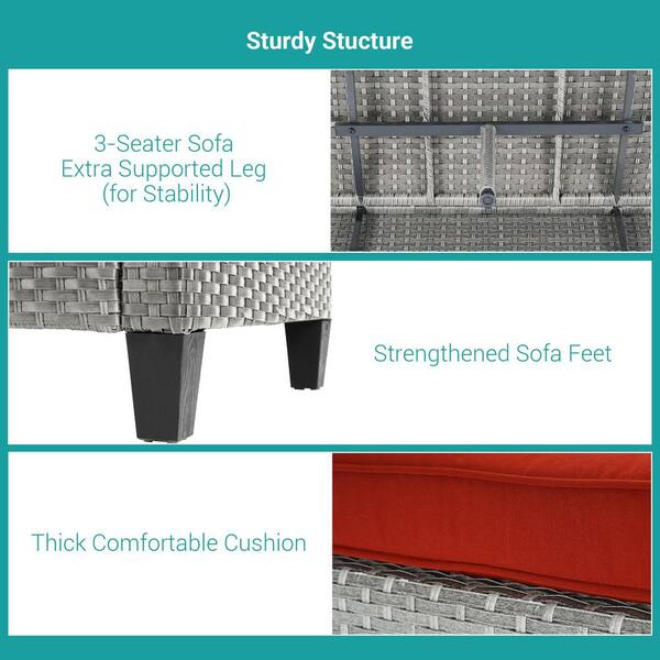 7-Piecess Patio Conversation Set with Loveseat Sofa and Side Table All-Weather Gray Wicker with Rust Red Cushions