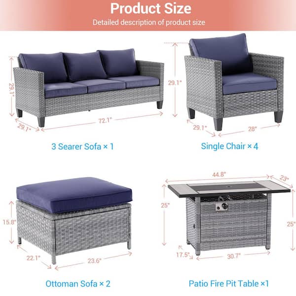 8-Pieces Patio Conversation Set with Rectangle Fire Pit Table, Gray Wicker Wide Armrests Sofa with Navy Blue Cushion