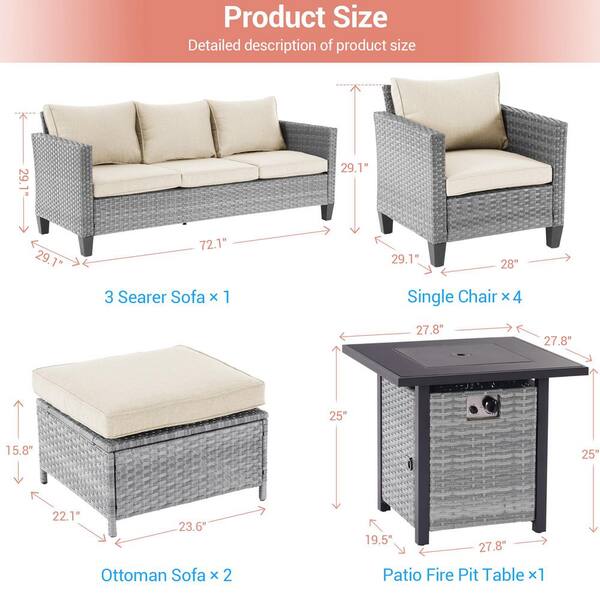 8-Piecess Patio Conversation Set with Square Fire Pit Table, Gray Wicker Wide Armrests Sofa with Beige Cushion