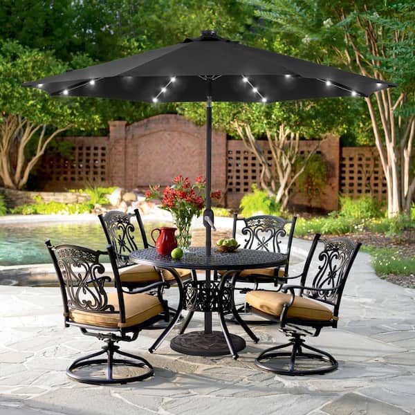 9 ft. Solar LED Market Patio Umbrellas with Solar Lights and Tilt Button in Dull Black