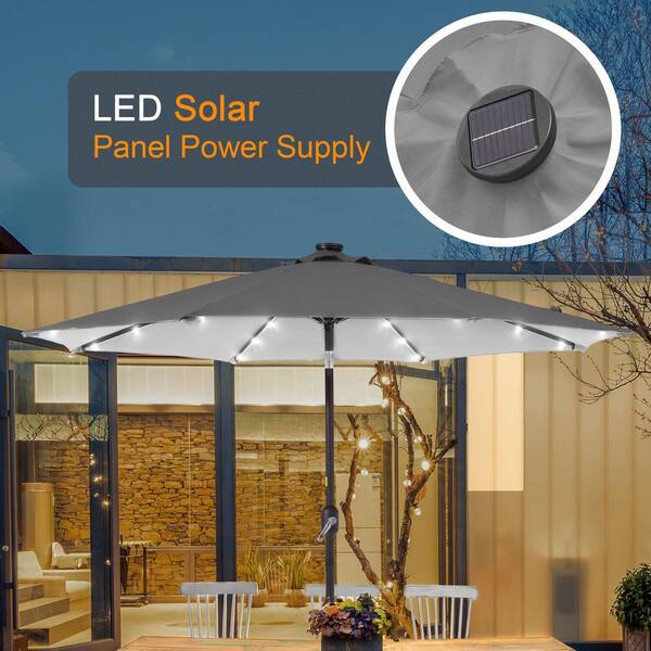 9 ft. Solar LED Market Patio Umbrellas with Solar Lights and Tilt Button in Gray