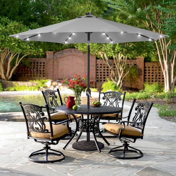 9 ft. Solar LED Market Patio Umbrellas with Solar Lights and Tilt Button in Gray