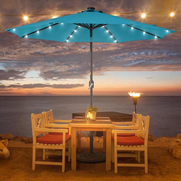 9 ft. Solar LED Market Patio Umbrellas with Solar Lights and Tilt Button in Turquoise