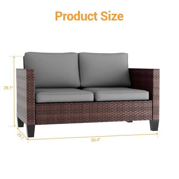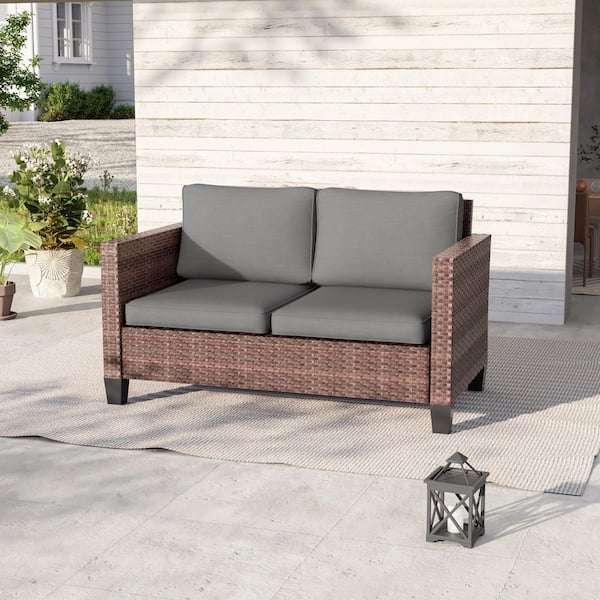 Metal Frame Brown Wicker Outdoor Loveseat Patio Chaise Lounge with High Back and Gray Cushions