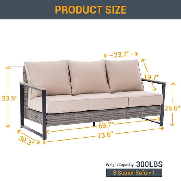 Outdoor 3-Seater Sofa Patio Conversation Set All-Weather Sofa PE Rattan Gray Wicker with Sand Cushion