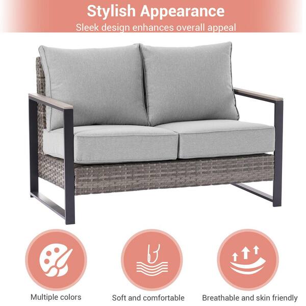 Outdoor Loveseat Sofa Patio Conversation Set 2 Seater Furniture with High Back and Gray Wicker Linen Grey Cushions