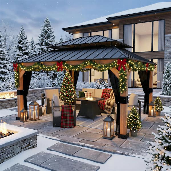 13 ft. x 11 ft. Double Galvanized Steel Roof Cedar Wood Frame Outdoor Patio Hardtop Gazebo with Mosquito Netting