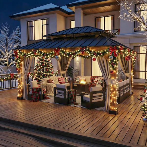 15 ft. x 13 ft. Wood Grain Aluminum Double Galvanized Steel Roof Gazebo with Ceiling Hook, Mosquito Netting and Curtains