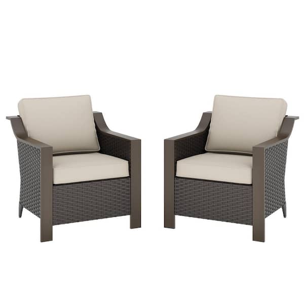2-Piece Wicker Outdoor Lounge Chair with Gracefully Sloped Armrest and Beige Cushions